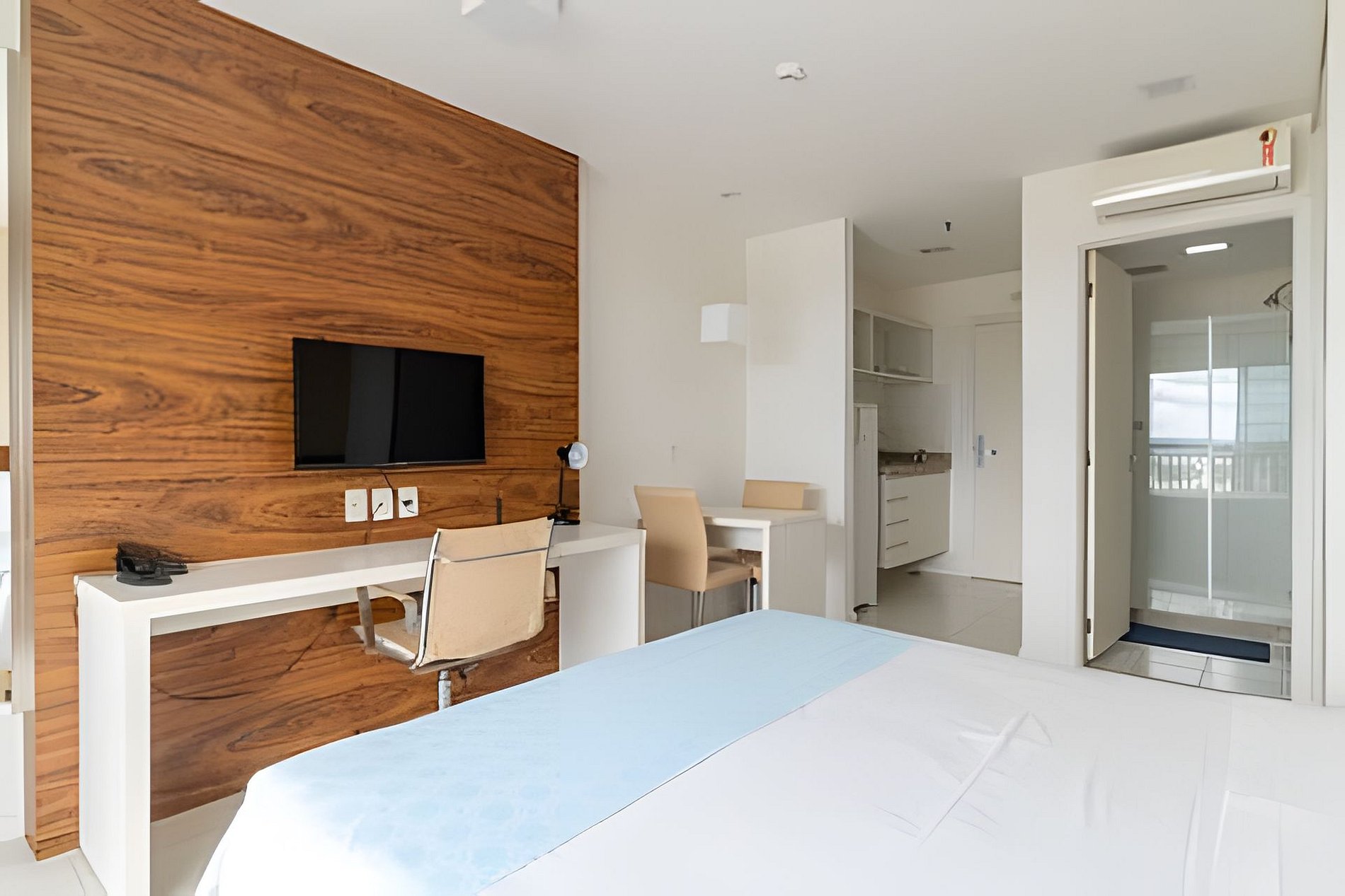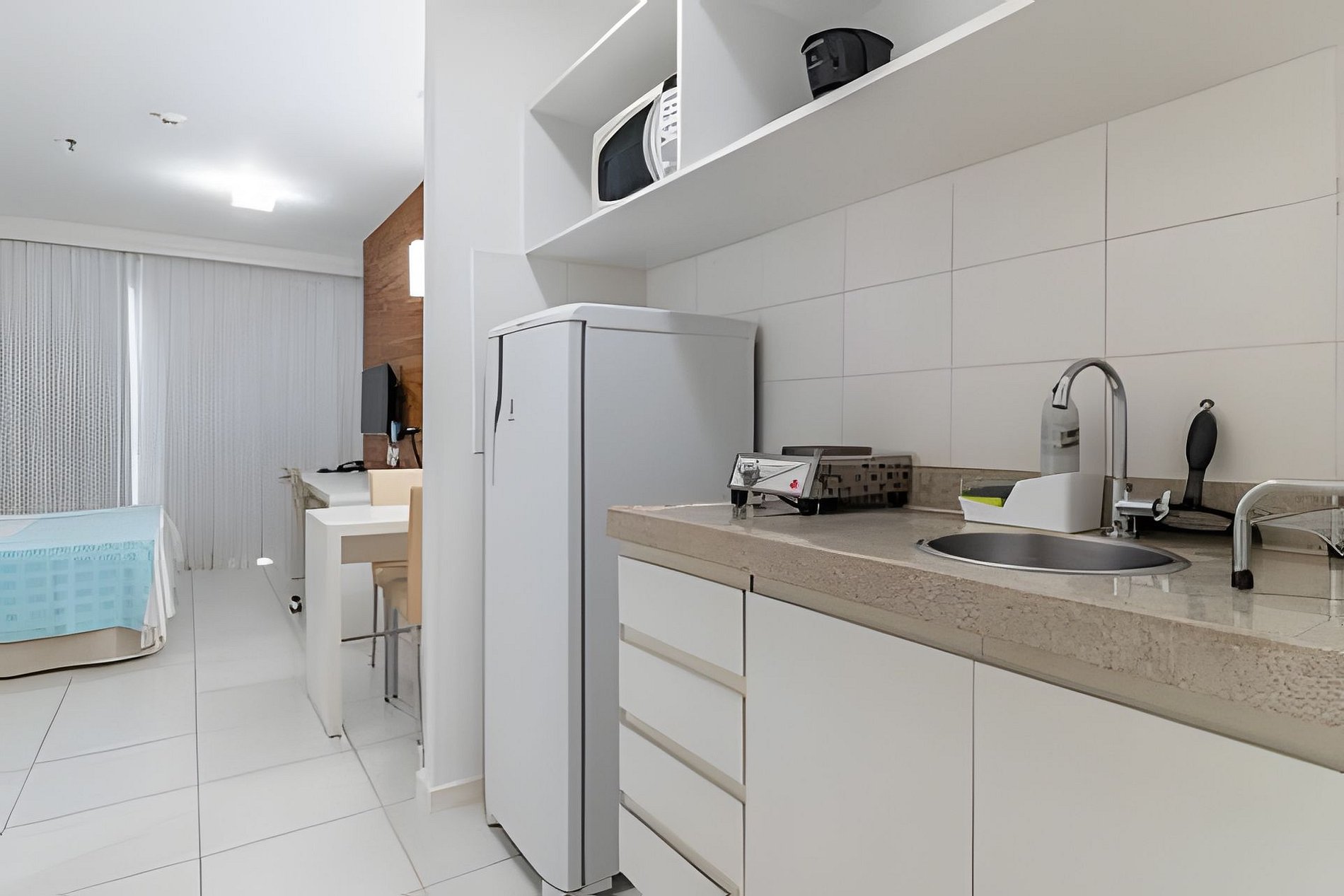 O espaço conta com uma cozinha bem equipada. Temos geladeira, microondas, fogão, sanduicheira, cafeteira, pratos, talheres, e todos utensílios básicos. Contamos com uma cama de casal queen size, uma mesa para trabalho, uma tv 32 smart tv, Netflix , Wi-Fi, guarda roupa, ar condicionado, ferro de passar, secador de cabelo.